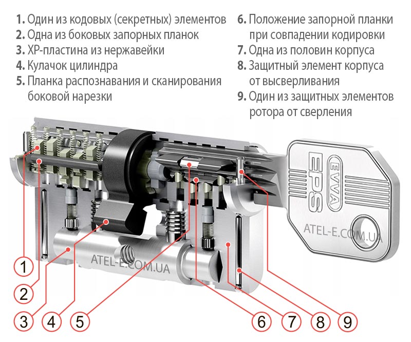 Цилиндровый механизм EPS относится к младшей серии сердцевин EVVA. Несмотря на это, он обеспечивает достаточно высокий уровень защиты от интеллектуальных методик открытия цилиндров. Секретность механизма базируется на механической системе кодирования, состоящей из комбинации двух сканирующих ключ в разных плоскостях систем — основной, гибридного типа, и боковой.